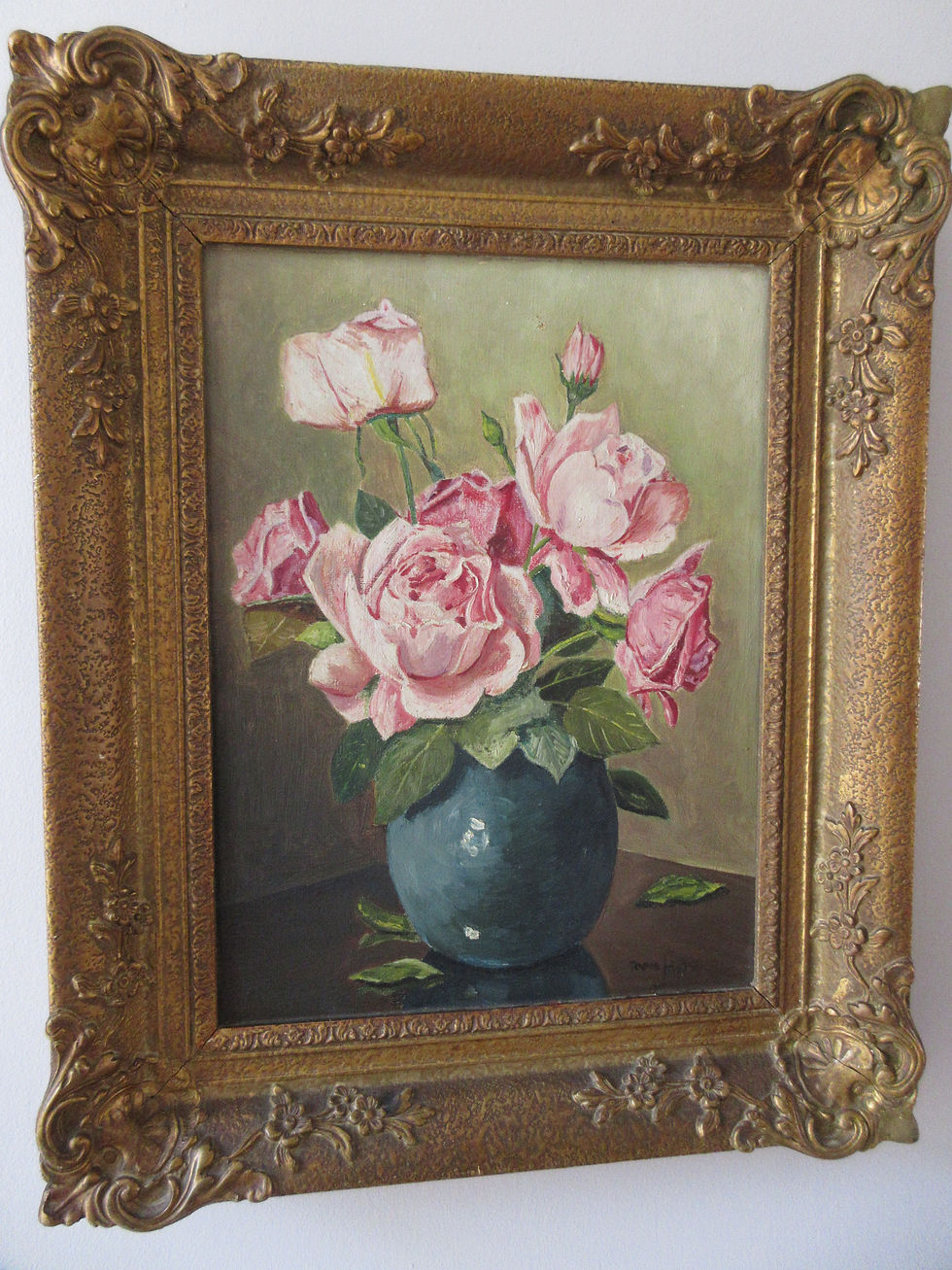 oil painting, pink roses in a vase.